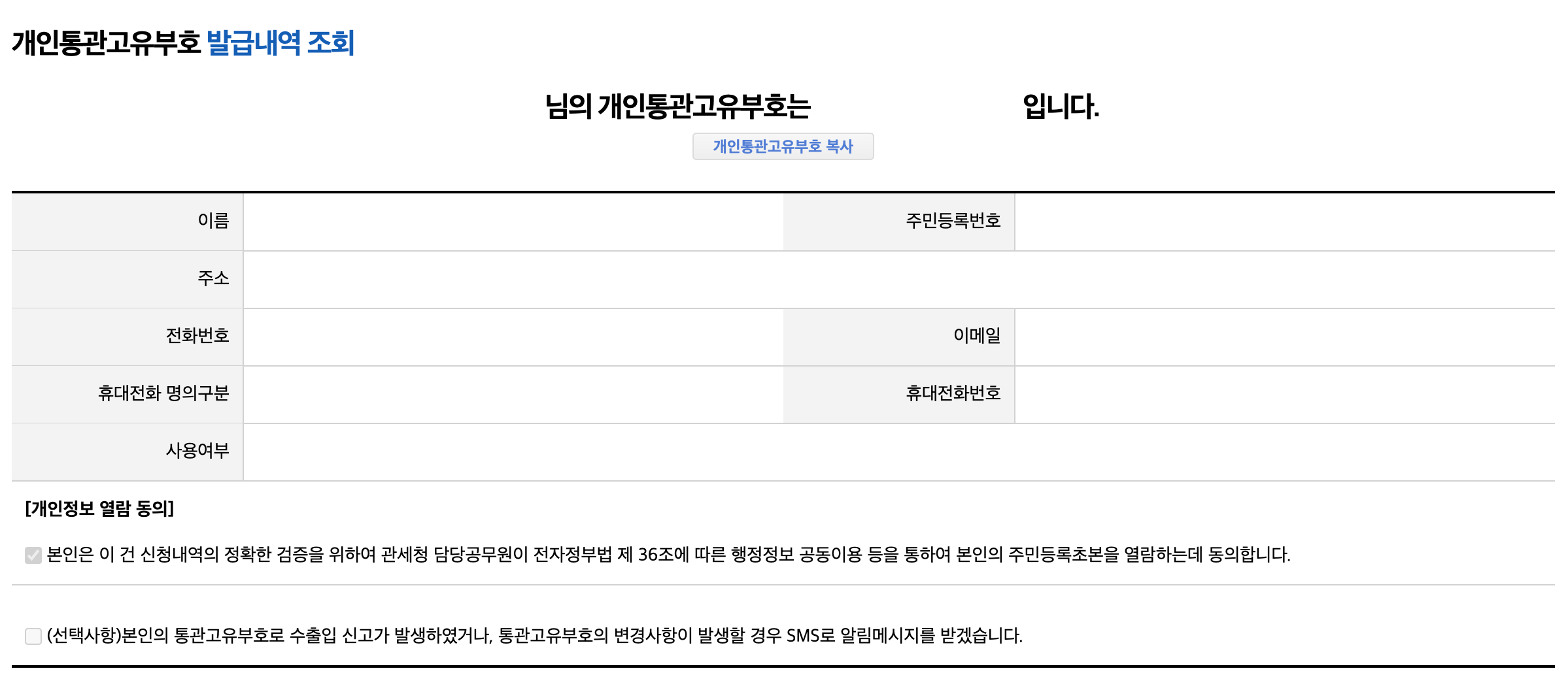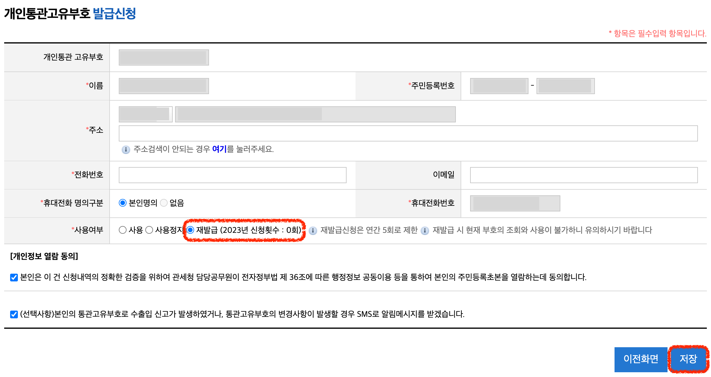 3️⃣ 개인통관고유부호 발급 신청을 위해 주소, 전화번호, 휴대전화 명의구분 정보를 입력합니다.