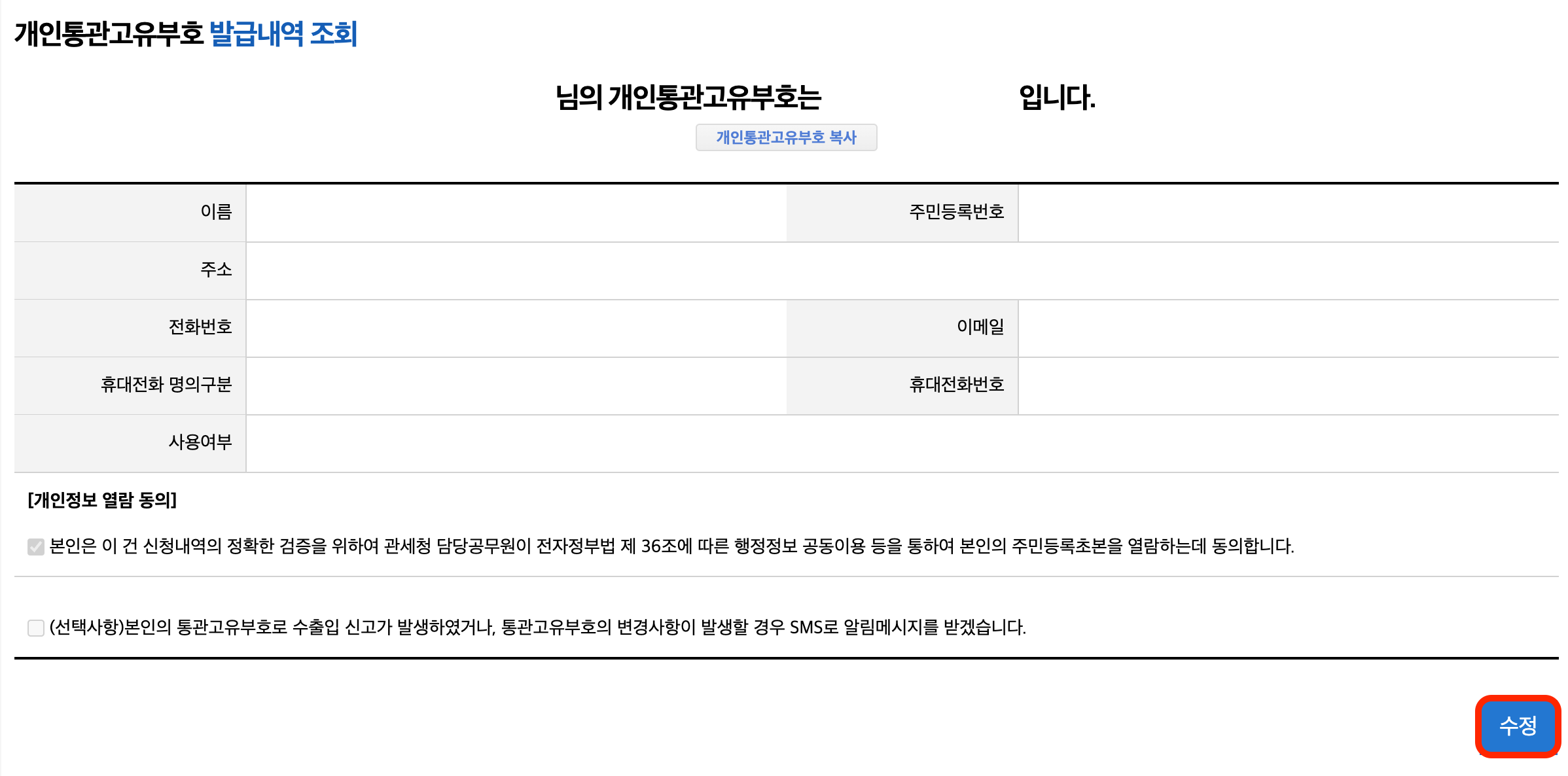4️⃣ 개인통관고유부호를 확인하고, 오른쪽 아래의 '수정' 버튼을 클릭합니다.