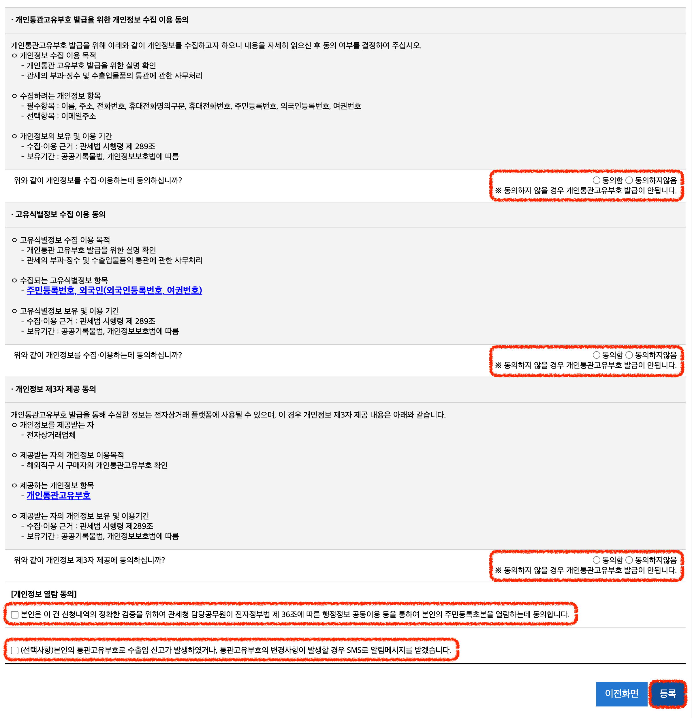 → (선택사항) SMS로 알림메시지를 받겠습니다. 는 통관 정보 확인을 위해 동의하는 게 좋습니다!