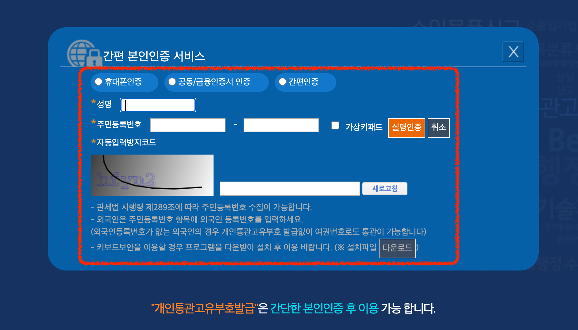 → 자동입력방지코드를 입력하고 '실명인증' 버튼을 클릭해야 합니다.