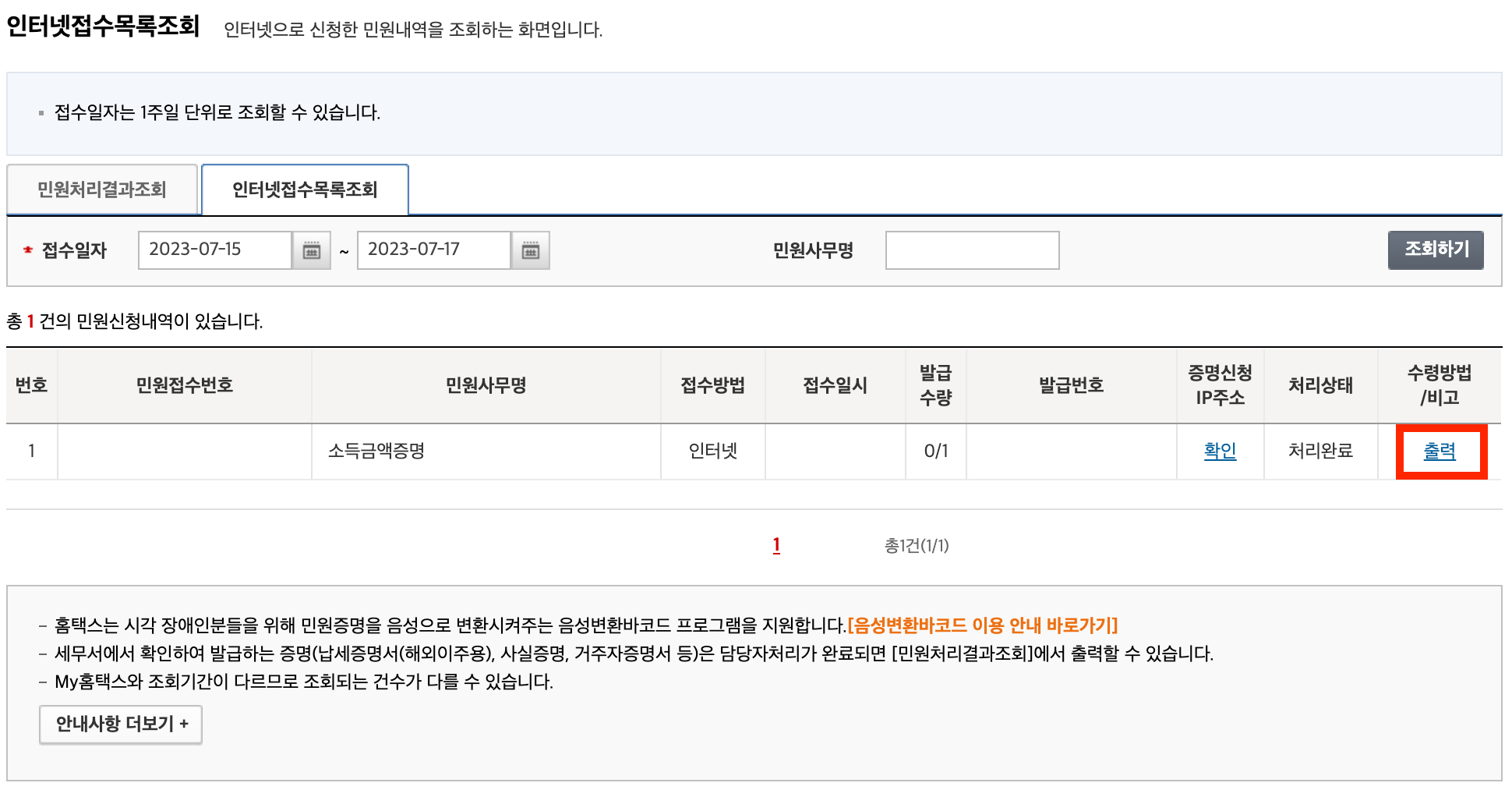 인터넷접수목록조회에서 출력 버튼을 눌러서, 증명서를 프린트할 수 있습니다.