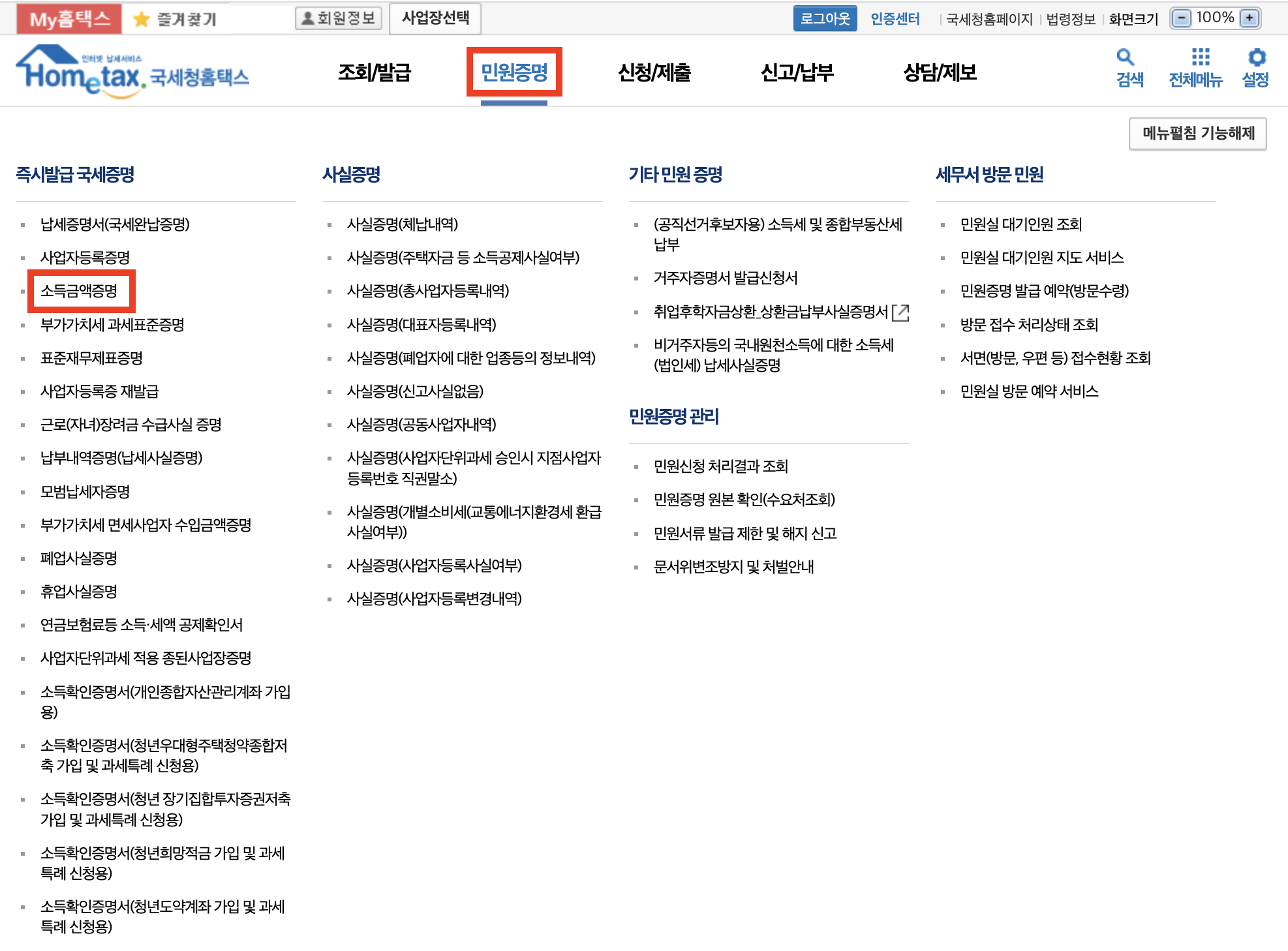 로그인 후, [민원증명] > [소득금액증명]을 클릭합니다.