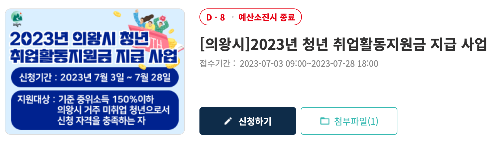 의왕시 청년 취업활동지원금은 7월 3일 9시부터 신청을 시작했습니다. 신청 기간은 7월 28일 18시까지로 현재부터 일주일 밖에 남지 않았습니다. 신청하려고 생각하다가 까먹으면 바로 취업활동지원금을 받을 수 있는 기회를 놓치기 때문에, 지금 바로 신청하시기 바랍니다!